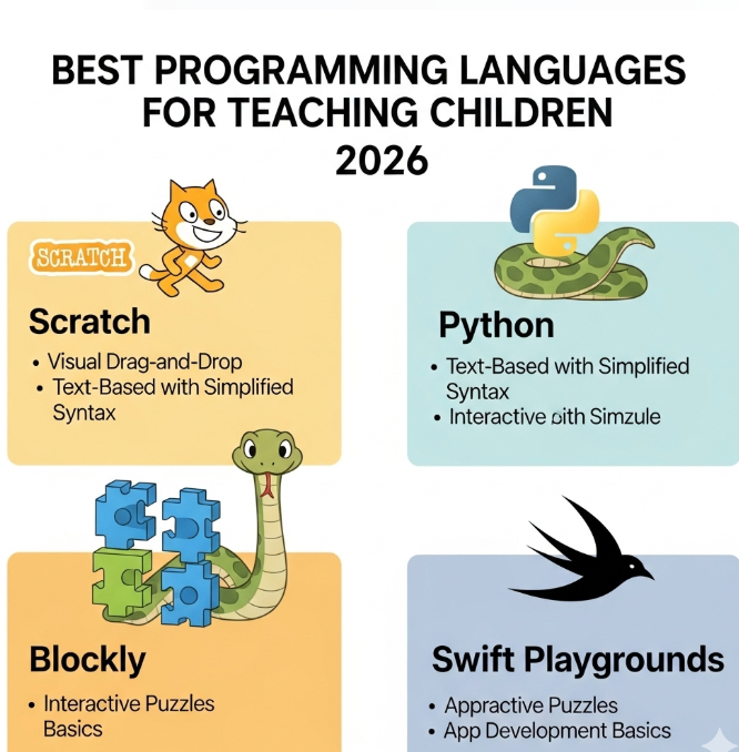 اكتشف أفضل لغات البرمجة للأطفال لعام 2026. تعرّف على Scratch, Python, JavaScript وTynker، والفئات العمرية المناسبة، والمقارنة بين سهولة التعلم والفوائد
